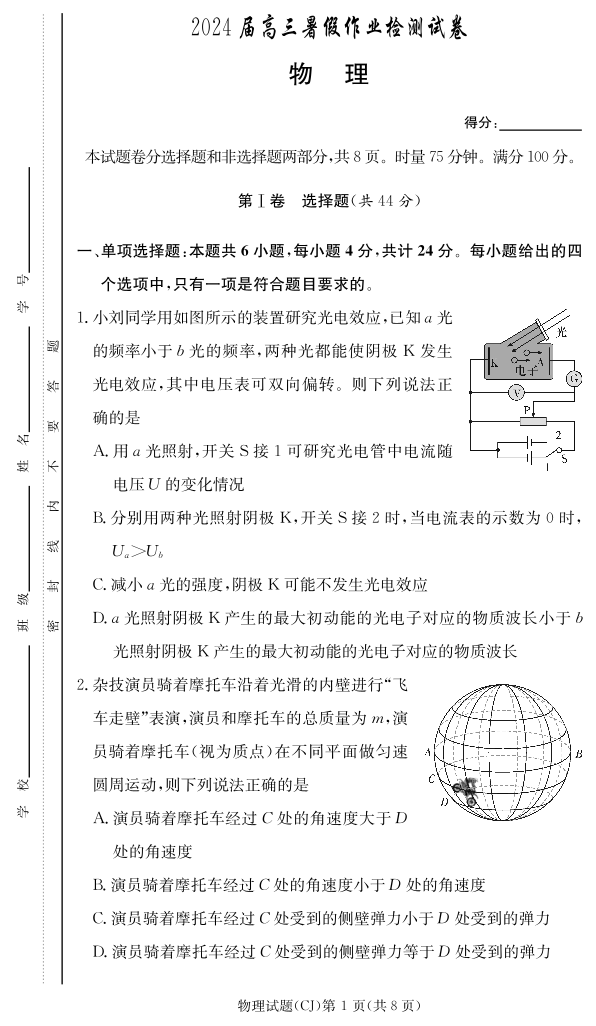 湖南省长沙市长郡中学2024届高三上学期入学考试物理