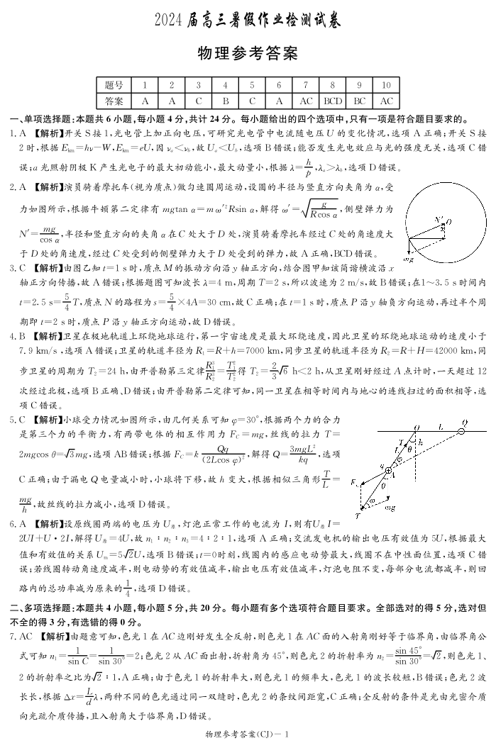 湖南省长沙市长郡中学2024届高三上学期入学考试物理答案