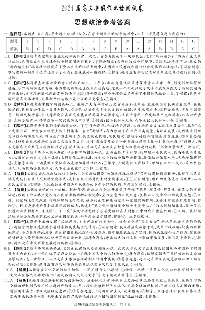 湖南省长沙市长郡中学2024届高三上学期入学考试政治答案