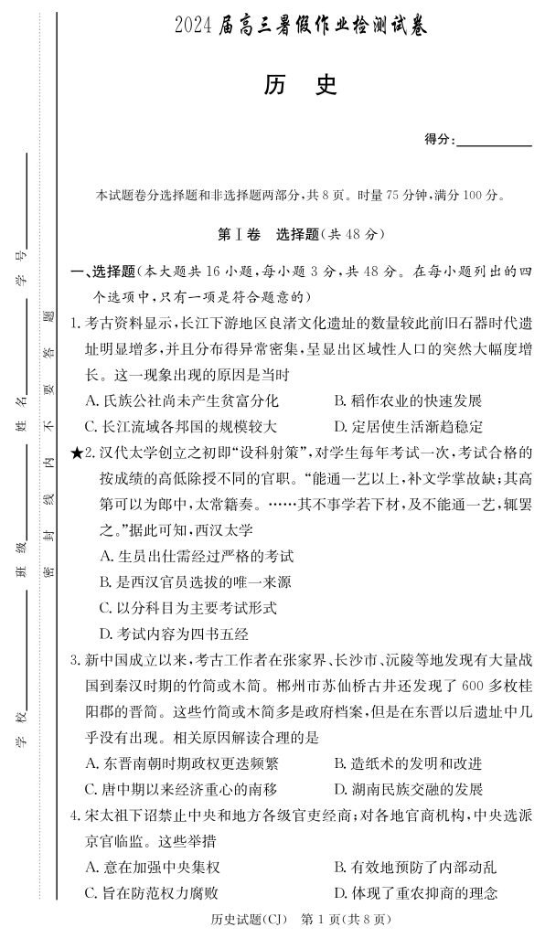 湖南省长沙市长郡中学2024届高三上学期入学考试历史