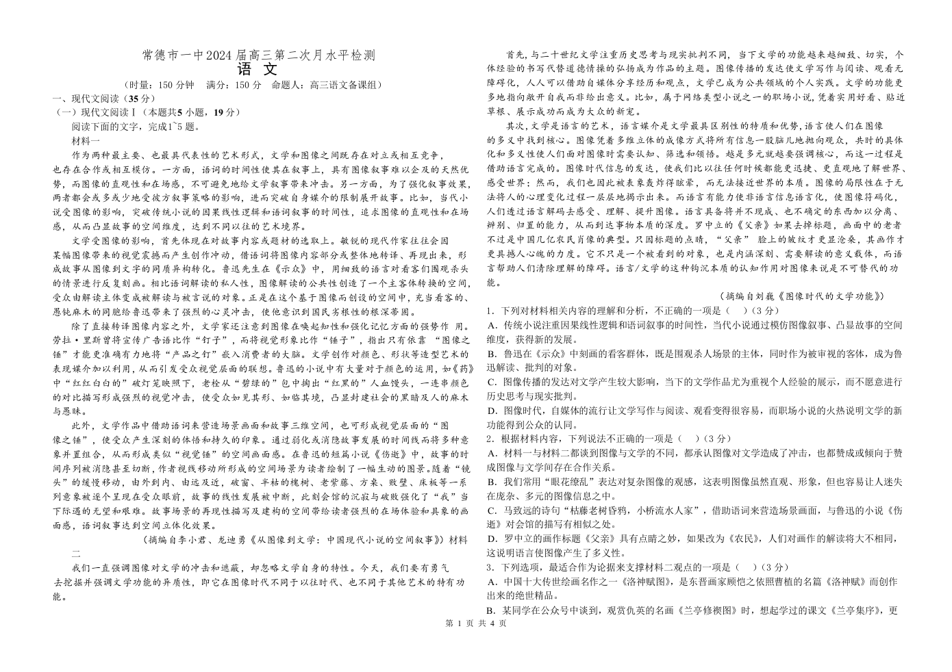 湖南省常德市第一中学2024届高三上学期第二次月考语文
