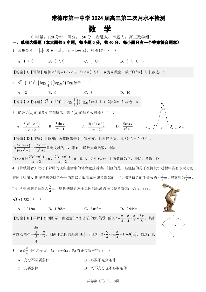湖南省常德市第一中学2024届高三上学期第二次月考数学+答案