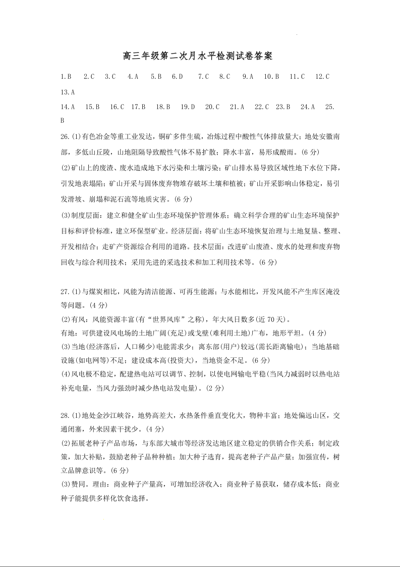 湖南省常德市第一中学2024届高三上学期第二次月考地理答案