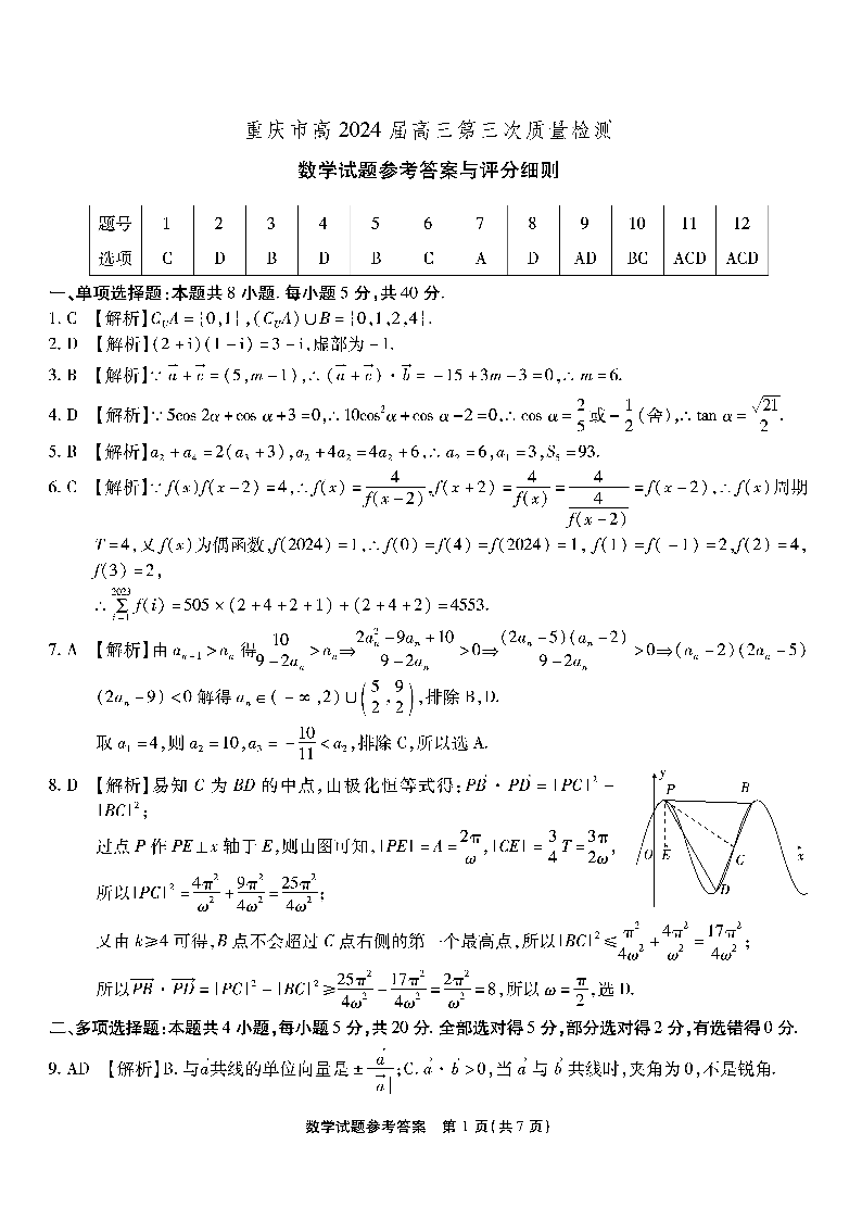 重庆市南开中学2024届高三第三次质量检测数学答案