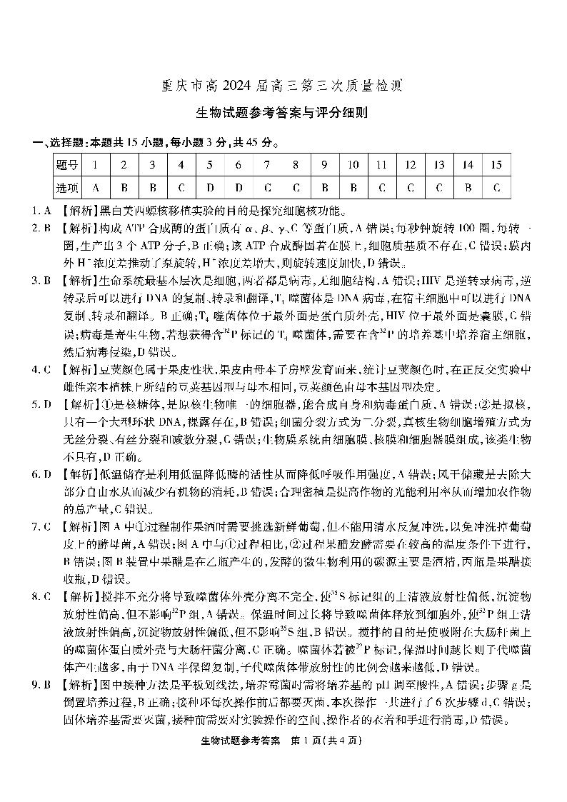 重庆市南开中学2024届高三第三次质量检测生物答案