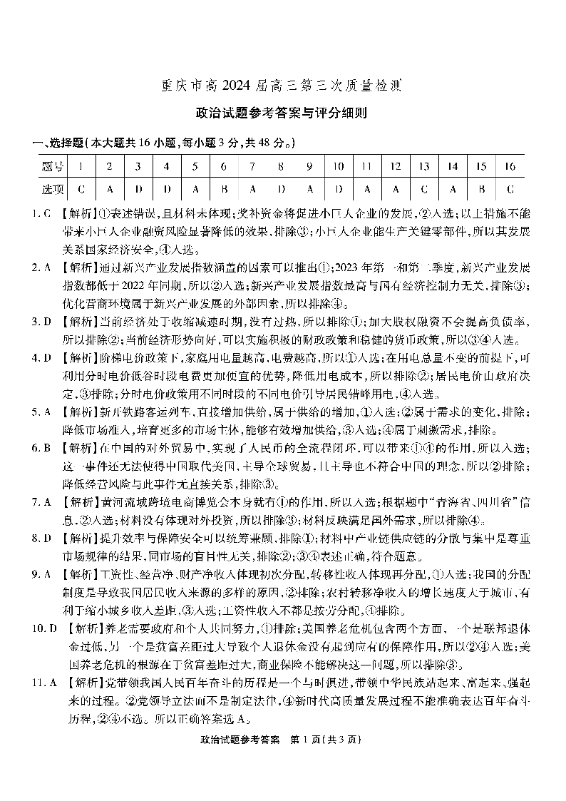 重庆市南开中学2024届高三第三次质量检测政治答案