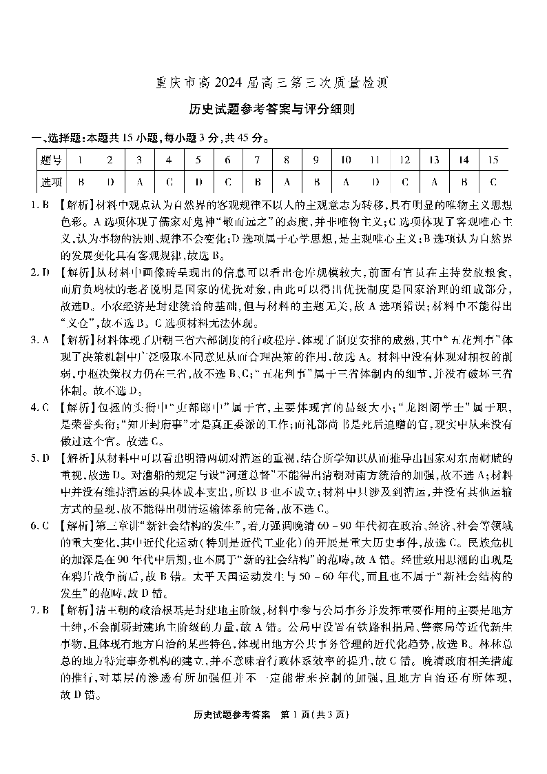 重庆市南开中学2024届高三第三次质量检测历史答案