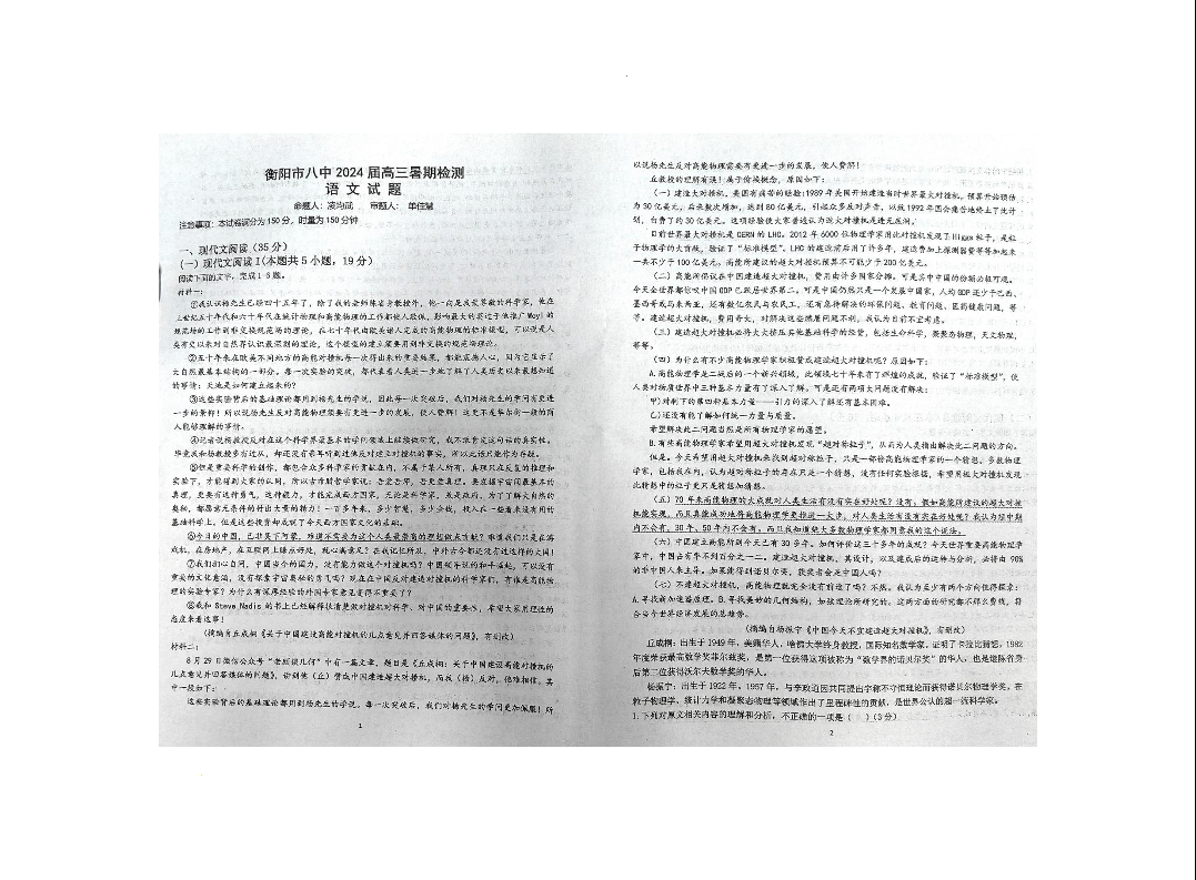 湖南省衡阳市第八中学2024届高三上学期开学检测语文
