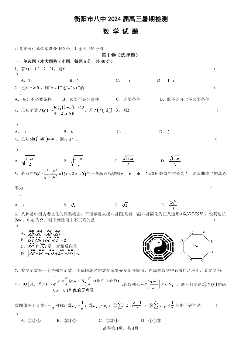 湖南省衡阳市第八中学2024届高三上学期开学检测数学