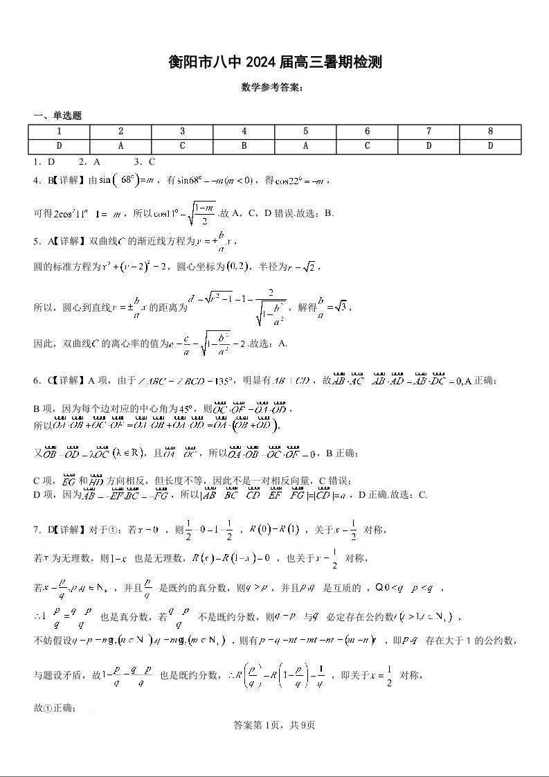 湖南省衡阳市第八中学2024届高三上学期开学检测数学答案