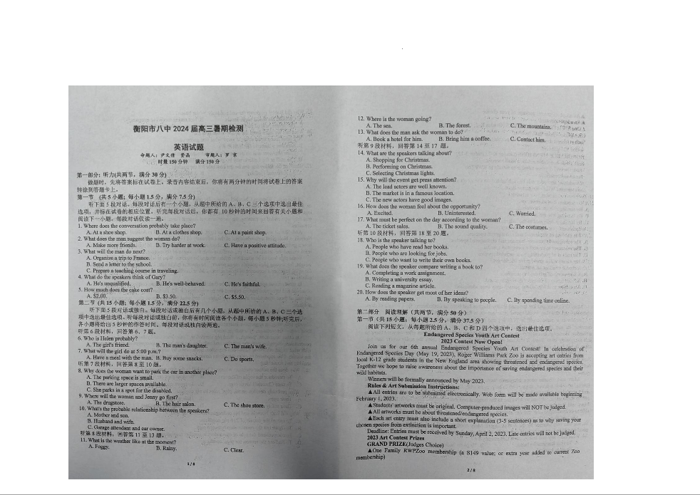 湖南省衡阳市第八中学2024届高三上学期开学检测英语