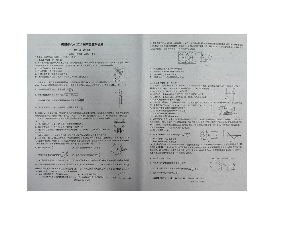 湖南省衡阳市第八中学2024届高三上学期开学检测物理
