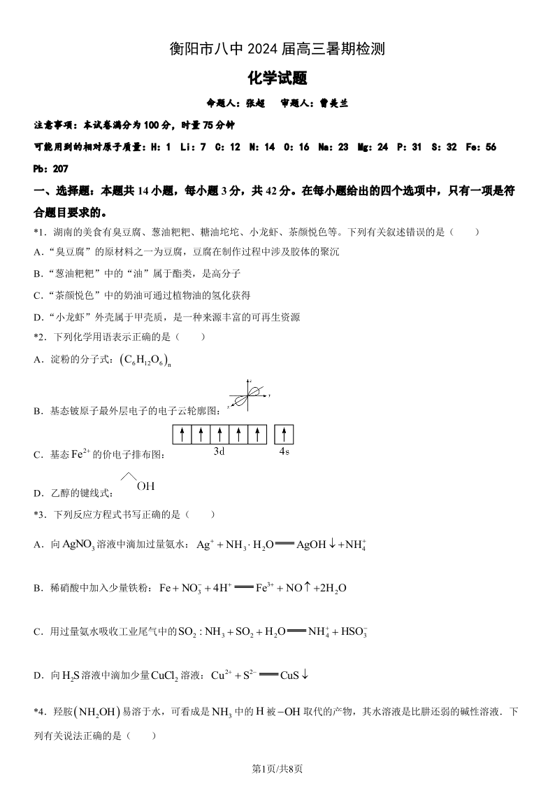 湖南省衡阳市第八中学2024届高三上学期开学检测化学