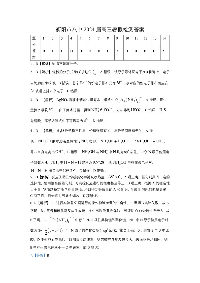 湖南省衡阳市第八中学2024届高三上学期开学检测化学答案