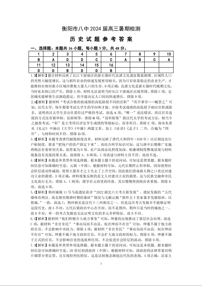 湖南省衡阳市第八中学2024届高三上学期开学检测历史答案