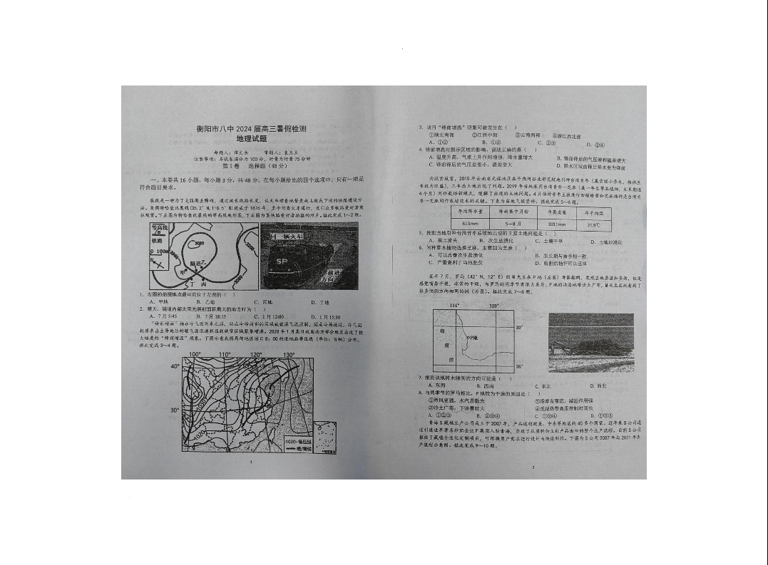 湖南省衡阳市第八中学2024届高三上学期开学检测地理