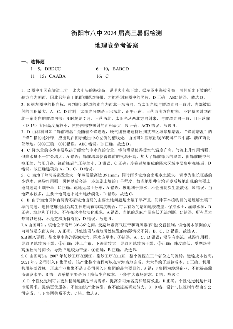 湖南省衡阳市第八中学2024届高三上学期开学检测地理答案
