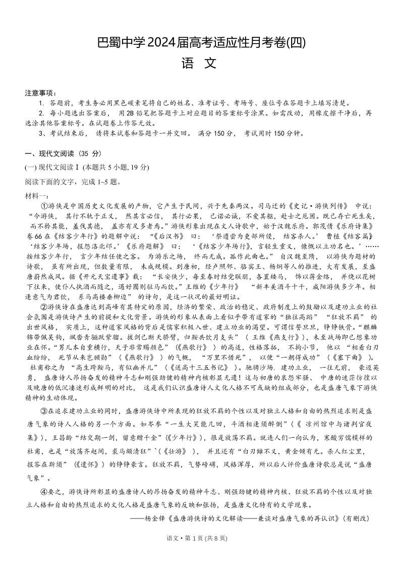 重庆市巴蜀中学2024届高考适应性月考卷(四)语文