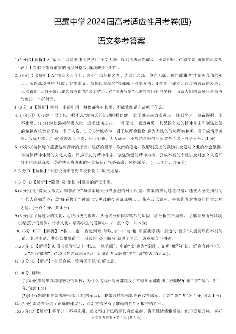 重庆市巴蜀中学2024届高考适应性月考卷(四)语文答案