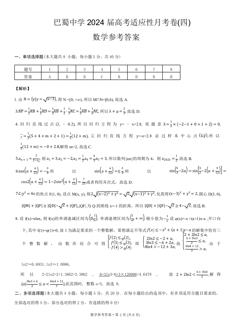 重庆市巴蜀中学2024届高考适应性月考卷(四)数学答案