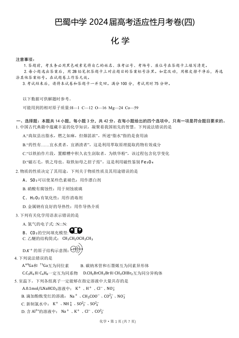 重庆市巴蜀中学2024届高考适应性月考卷(四)化学