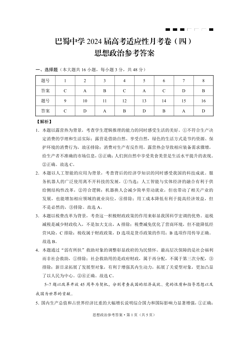 重庆市巴蜀中学2024届高考适应性月考卷(四)政治答案