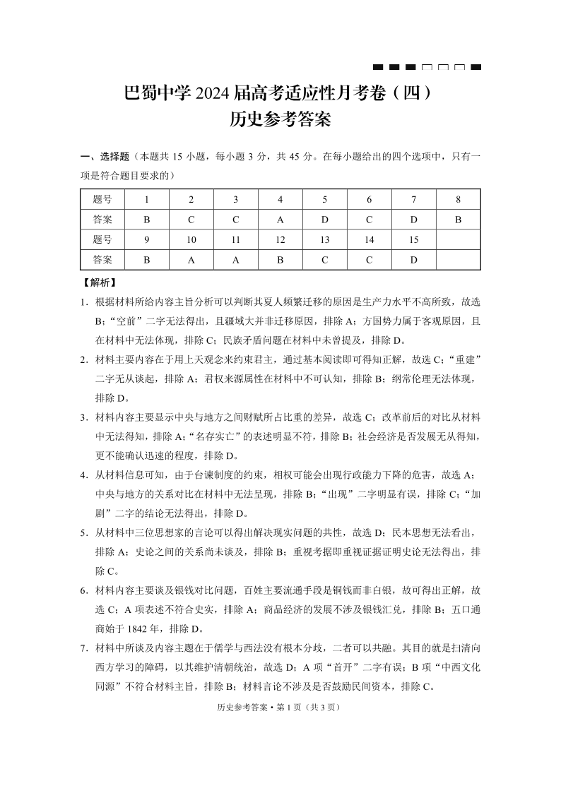 重庆市巴蜀中学2024届高考适应性月考卷(四)历史答案
