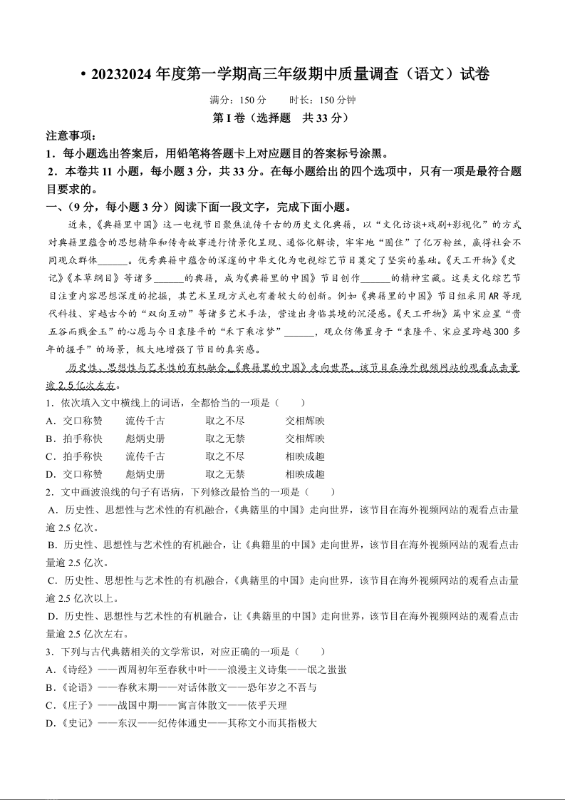 天津市实验中学滨海学校2024届高三上学期期中质量调查考试语文+答案