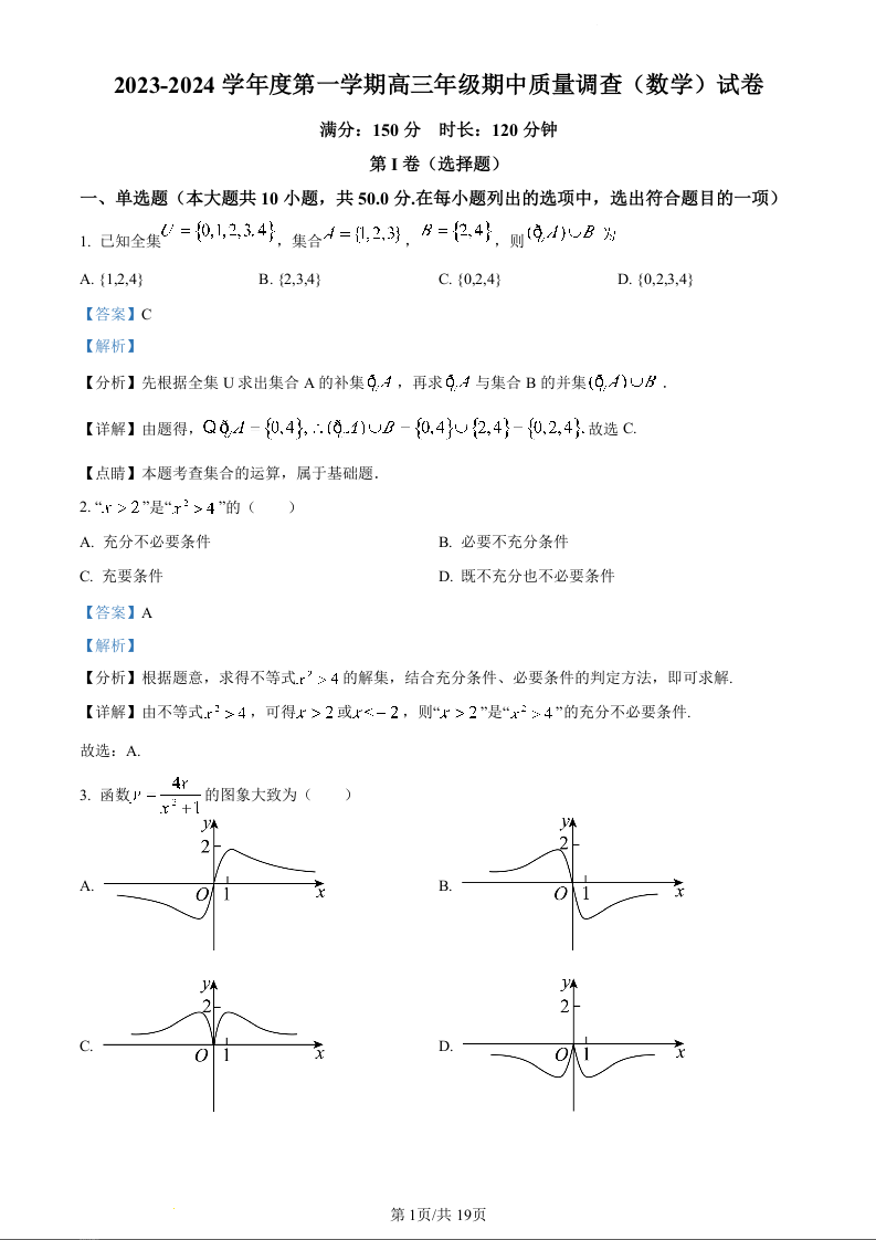 天津市实验中学滨海学校2024届高三上学期期中质量调查考试数学(精品解析版)