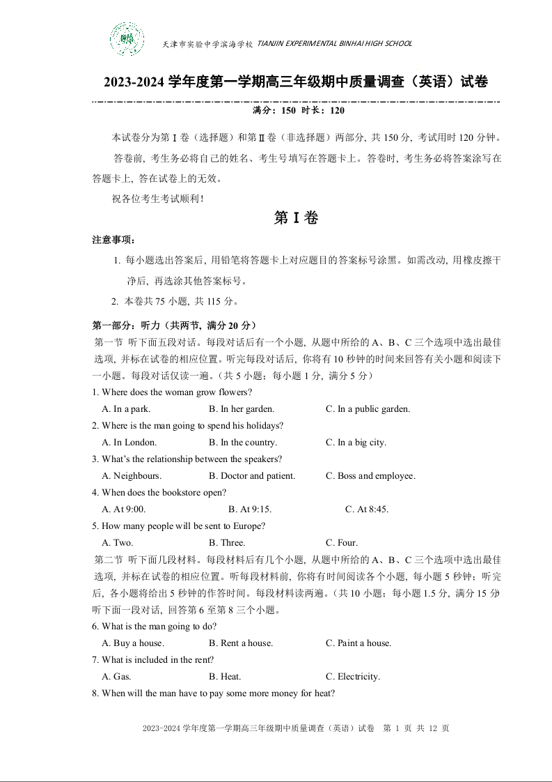 天津市实验中学滨海学校2024届高三上学期期中质量调查考试英语