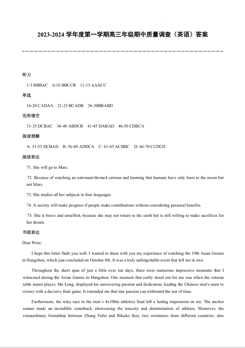 天津市实验中学滨海学校2024届高三上学期期中质量调查考试英语答案