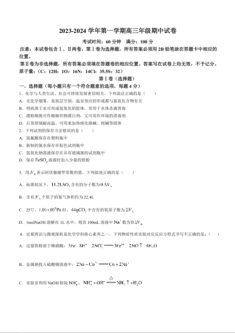 天津市实验中学滨海学校2024届高三上学期期中质量调查考试化学+答案
