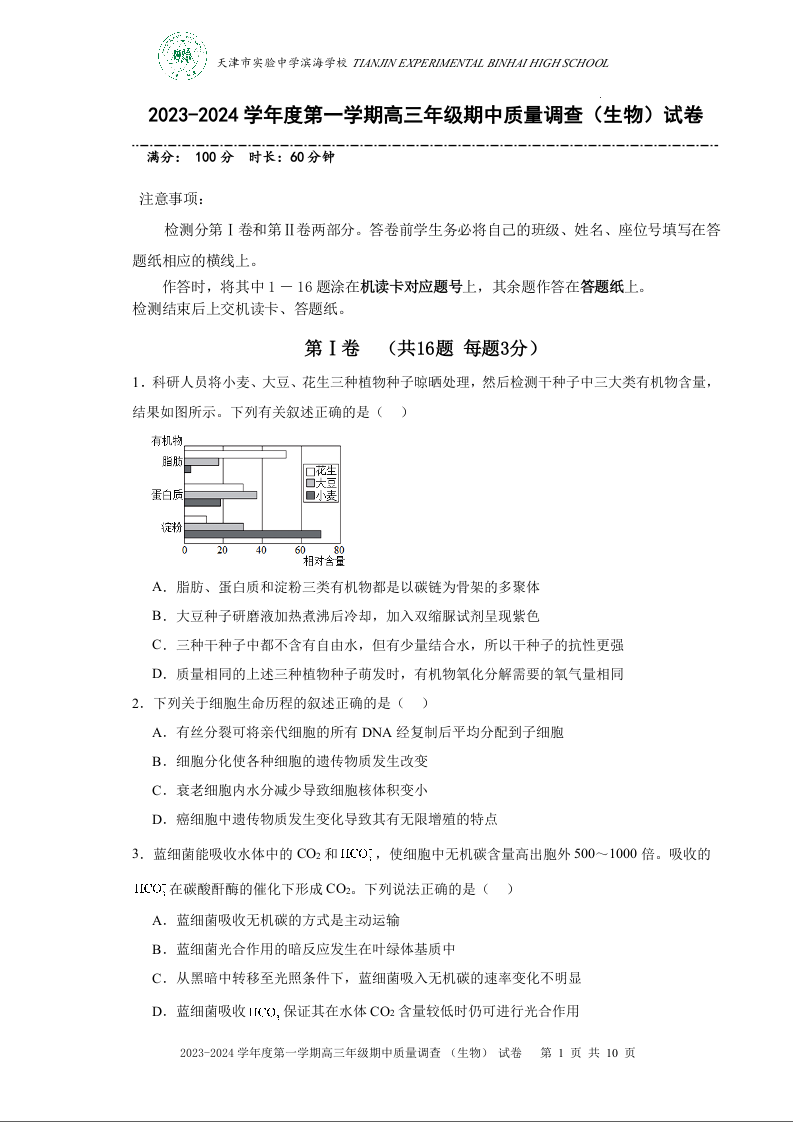 天津市实验中学滨海学校2024届高三上学期期中质量调查考试生物