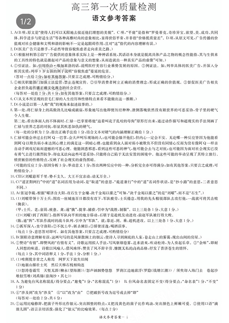 湖南省炎德英才大联考2024届高三上学期第一次质量检测语文答案