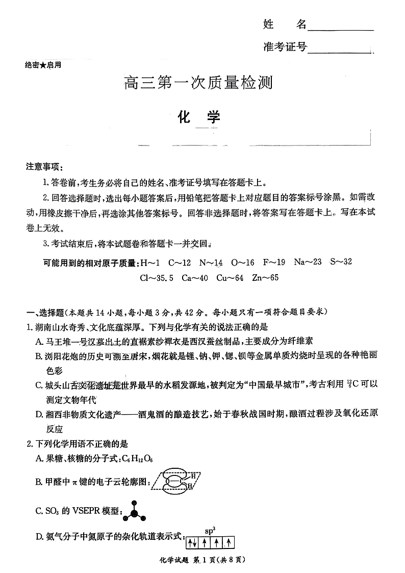 湖南省炎德英才大联考2024届高三上学期第一次质量检测化学