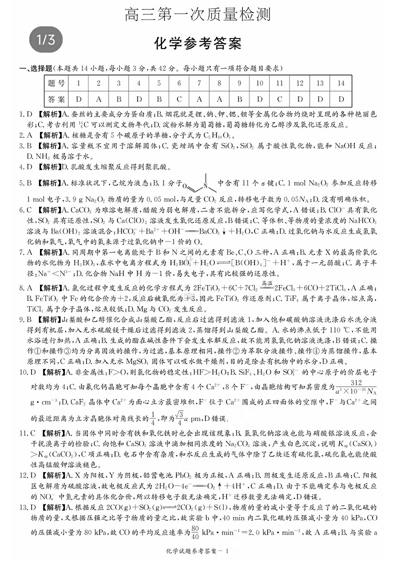 湖南省炎德英才大联考2024届高三上学期第一次质量检测化学答案