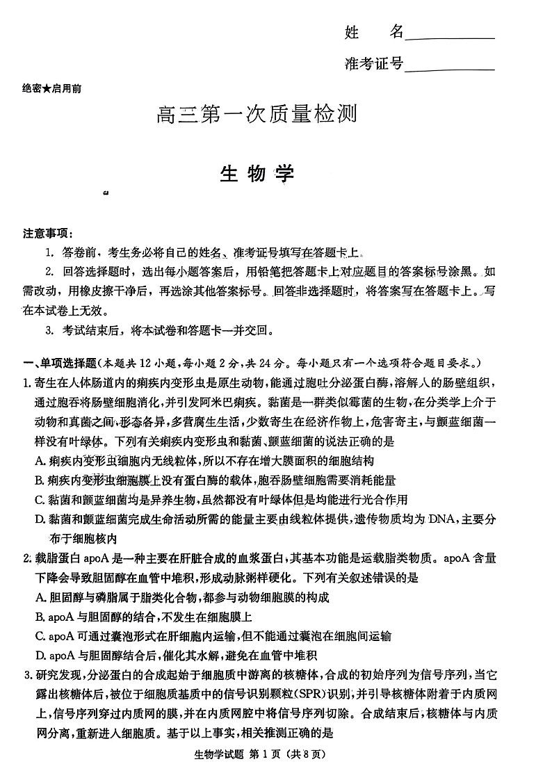 湖南省炎德英才大联考2024届高三上学期第一次质量检测生物