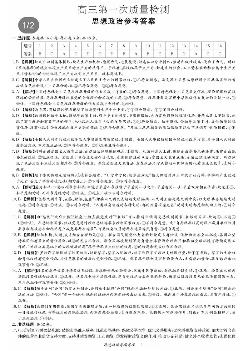 湖南省炎德英才大联考2024届高三上学期第一次质量检测政治答案