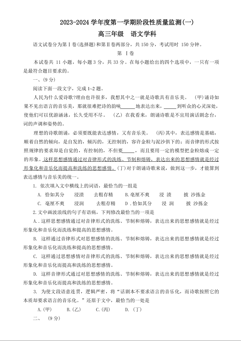 天津市南开区2024届高三上学期阶段性质量检测(一)语文