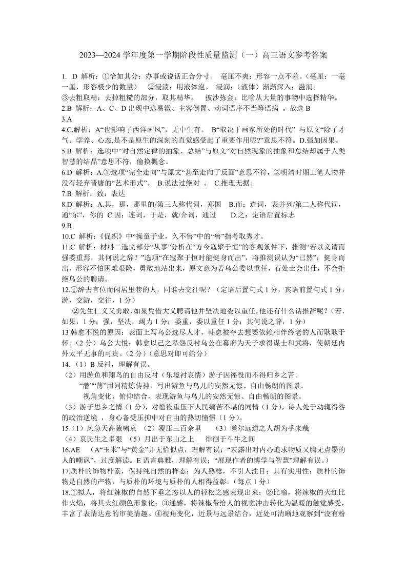 天津市南开区2024届高三上学期阶段性质量检测(一)语文答案
