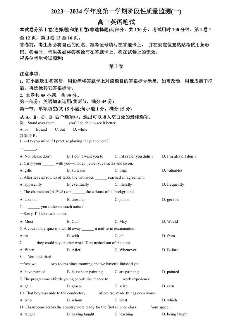 天津市南开区2024届高三上学期阶段性质量检测(一)英语+答案