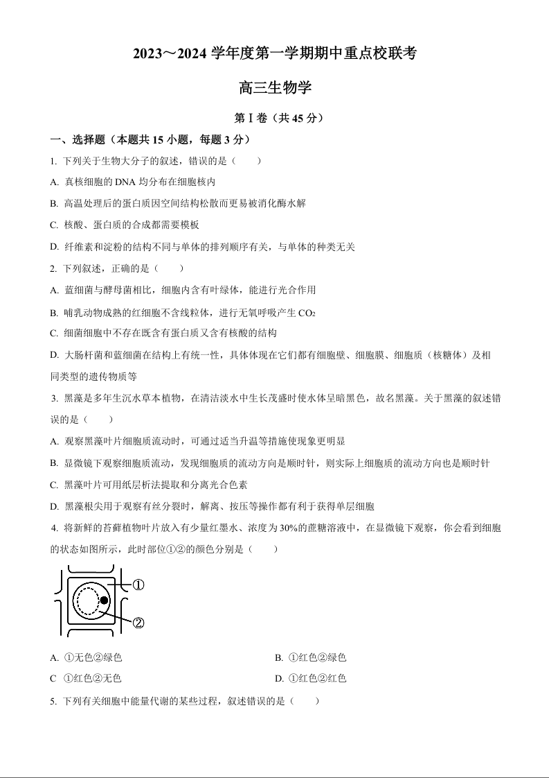 天津市南开区2024届高三上学期阶段性质量检测(一)生物+答案
