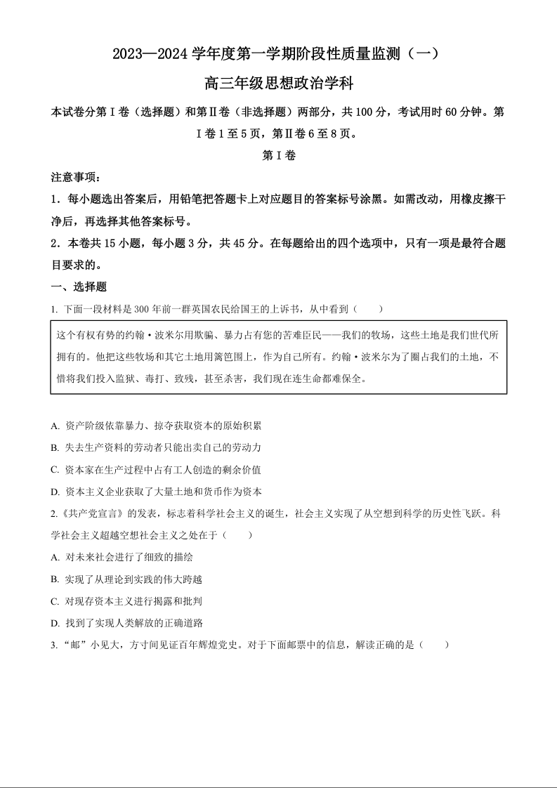 天津市南开区2024届高三上学期阶段性质量检测(一)政治+答案