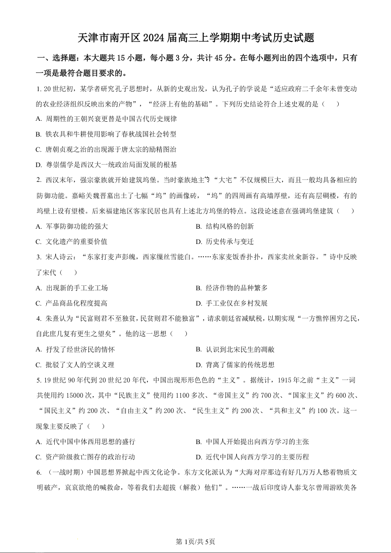 天津市南开区2024届高三上学期阶段性质量检测(一)历史(原卷版)