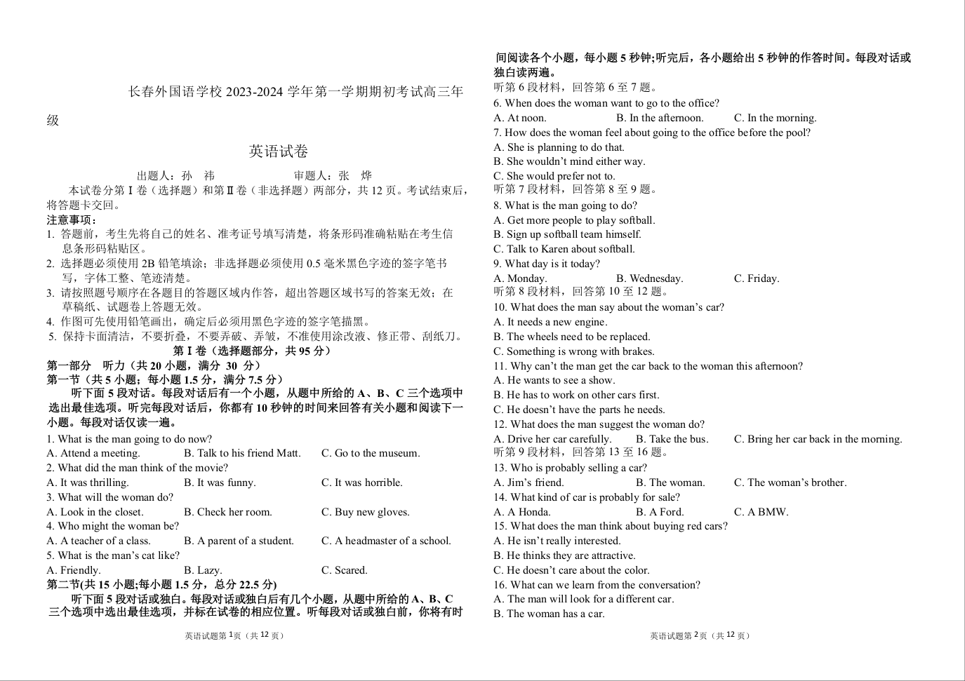 吉林省长春外国语学校2024届高三上学期开学考试英语+答案