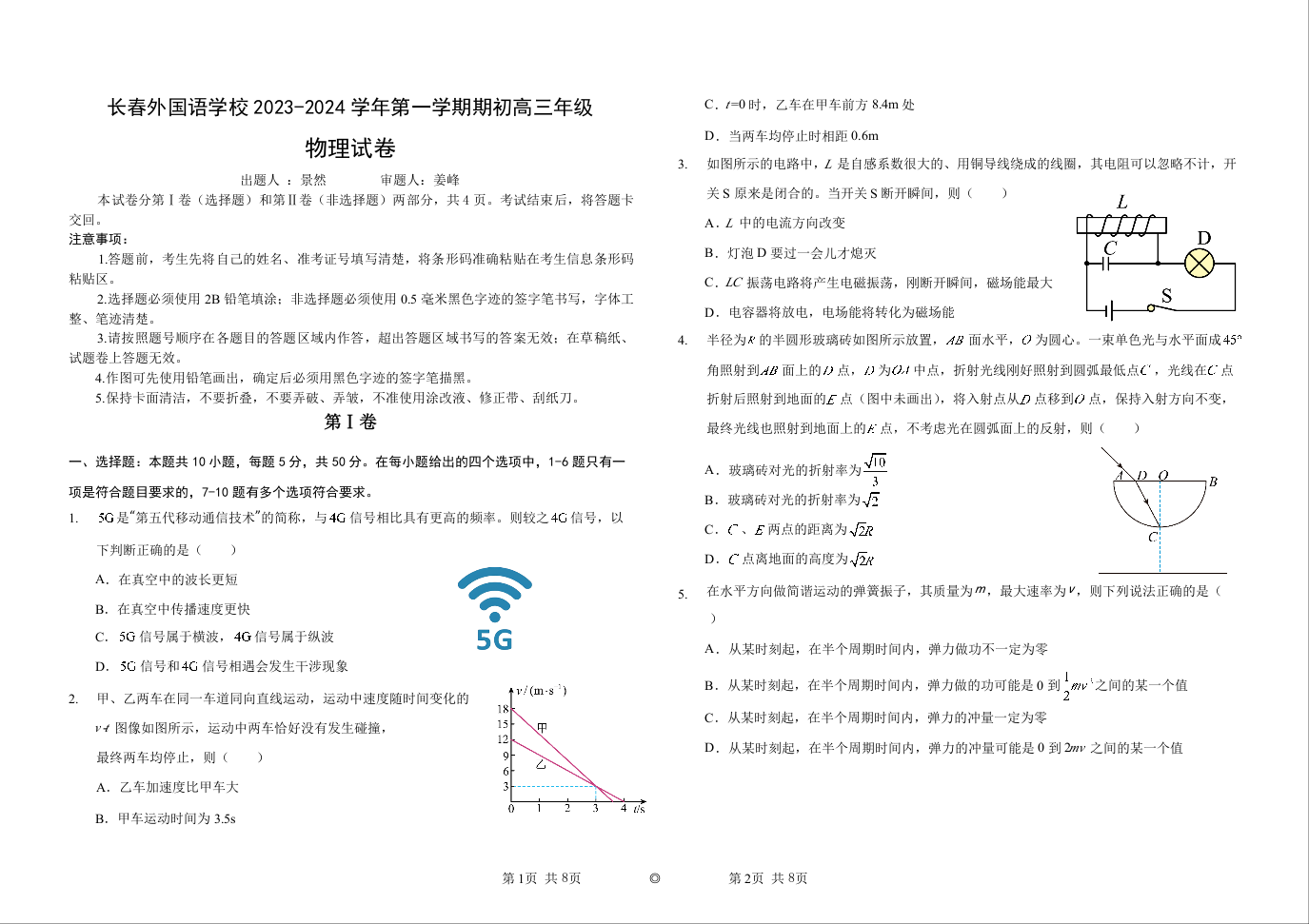吉林省长春外国语学校2024届高三上学期开学考试物理+答案