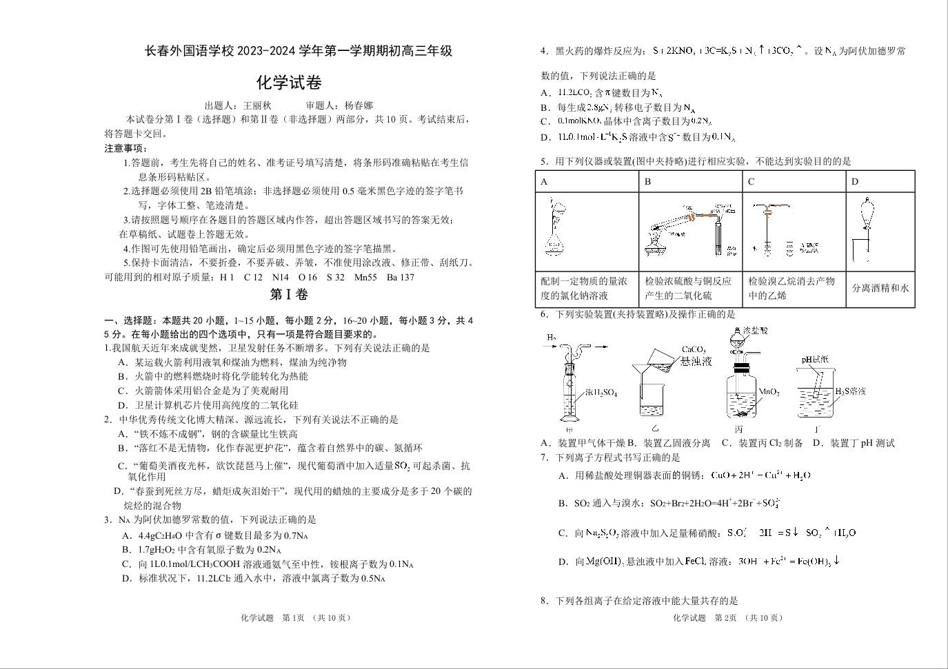 吉林省长春外国语学校2024届高三上学期开学考试化学+答案