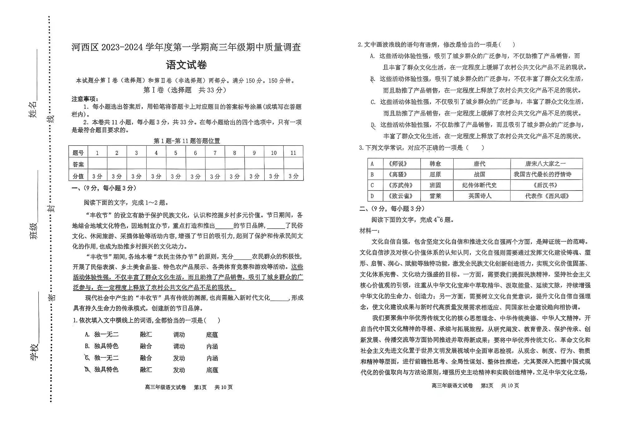 天津市河西区2023-2024学年高三上学期期中质量调查试题语文