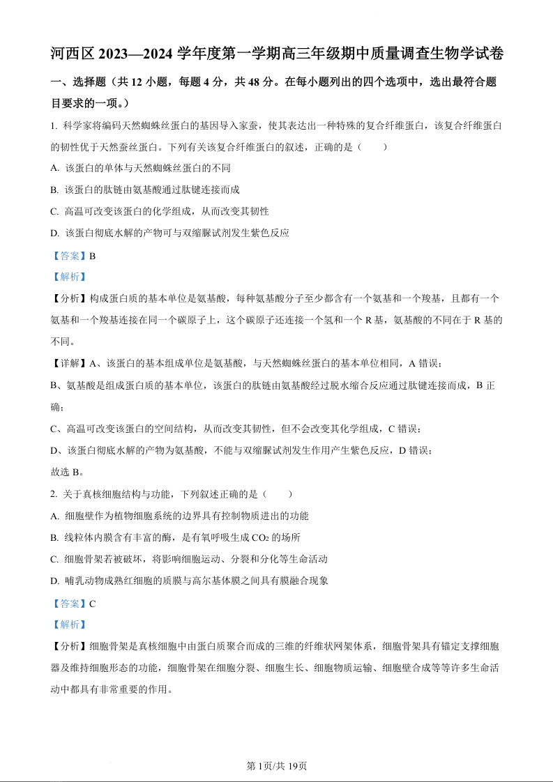 天津市河西区2023-2024学年高三上学期期中质量调查试题生物(精品解析版)
