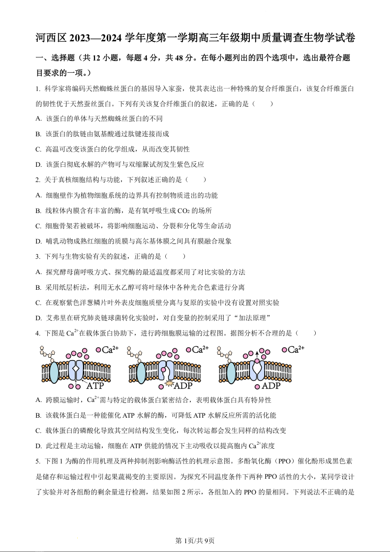 天津市河西区2023-2024学年高三上学期期中质量调查试题生物(原卷版)